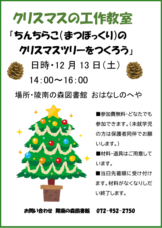 | 内容 | まつぼっくりやポンポンボールを使った、小さなクリスマスツリーを作ります。どなたでも参加していただけます。(未就学の方は保護者同伴) 参加費無料 |