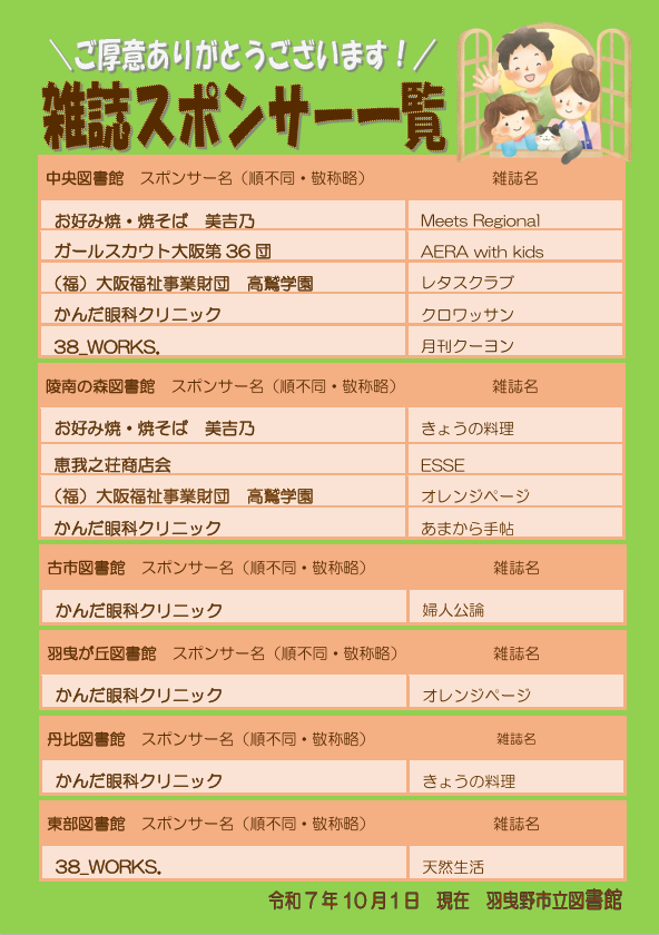 羽曳野市立図書館では、平成23年6月から「雑誌スポンサー制度」を実施しています。