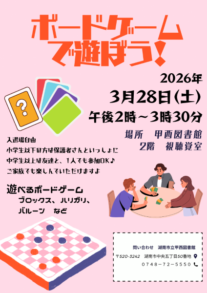 友だち同士や親子で「ブロックス」「ハリガリ」「バルーン」などのボードゲームを楽しみましょう。ひとりでも参加OKです。日時:3月28日(土)午後2時~3時30分