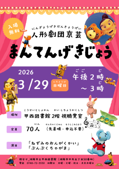 演目:「ねずみのおんがくかい」「ぶんぶくちゃがま」日時:3月29日(日)午後2時~3時