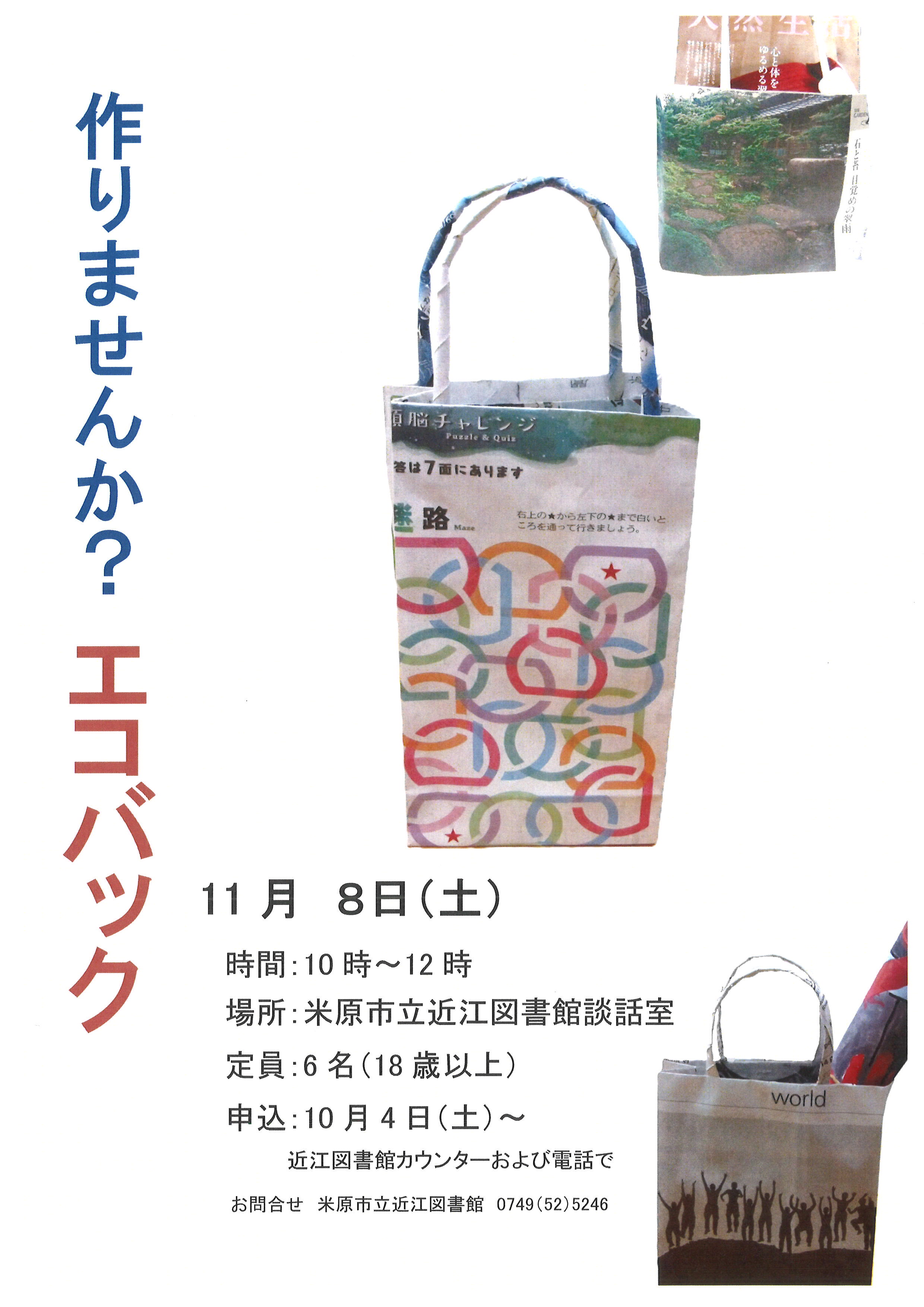 - 大人の造形教室「作りませんか?エコバック」(近江図書館)