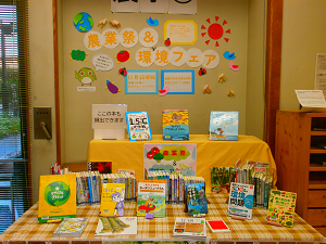 長岡京市の秋のお楽しみ!「農業祭&環境フェア」特集は農林振興課と環境政策室とトリプルコラボ!足元の土から地球全体まで、私たちが生きる世界について考える本を並べています。