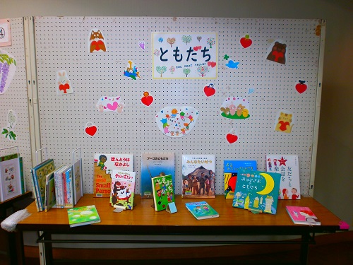 児童室入口の特集コーナー展示④ではともだちにまつわる本を集めています。ともだちと「こんな本を読んだよ!」とお話しするきっかけになるかも…!