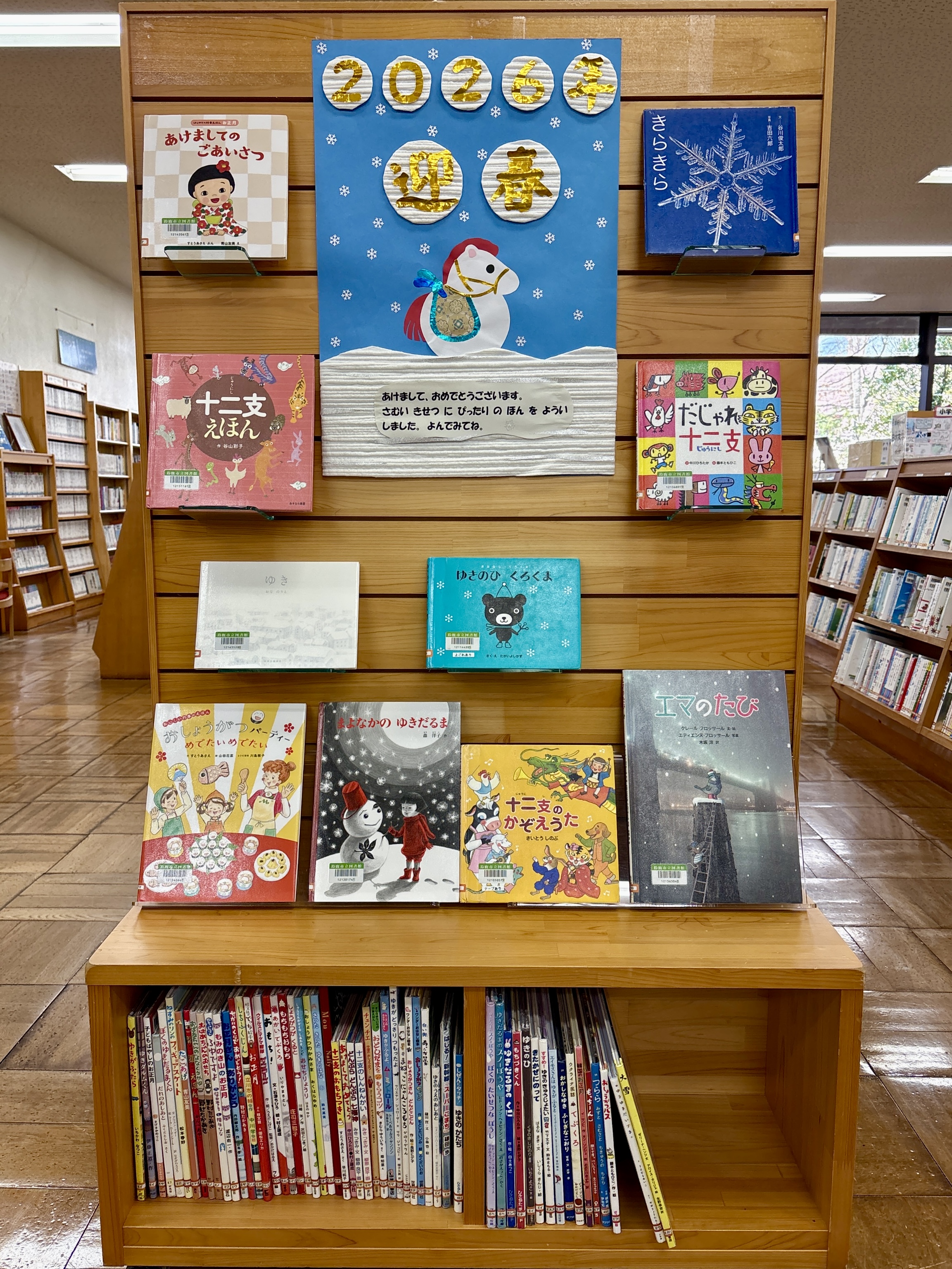 2026年1月11日日曜日まで、本館の一般閲覧室と児童閲覧室で、POP作品とその中で紹介された本を展示しています。