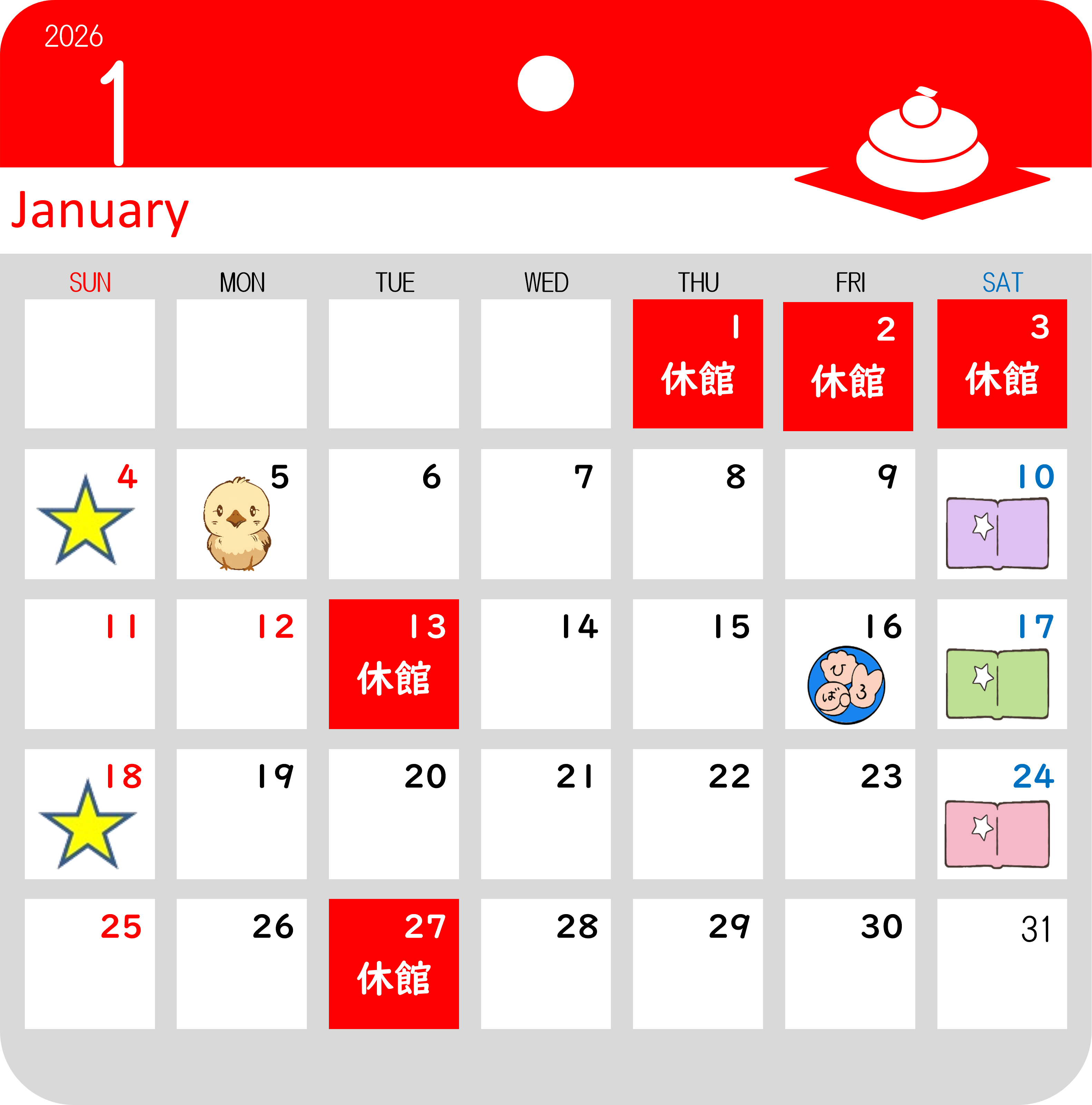 毎月第一土曜日 午後2時30分~本館 NPOグーチョキパー&極による絵本朗読会 ※11月はお休みです 毎月第二土曜日 午後2時30分~本館 おはなしどらちゃんによるおはなし会 ※10月11日はだんじりまつりに伴う交通規制のためお休みです 毎月第三土曜日 午後2時30分~本館 テディベアブッククラブによる「絵の本ひろば」 毎月第四土曜日 午後2時30分~本館 しおりちゃんのおはなし会 毎月第三金曜日 午前10時~本館 グーチョキパー ひろば 毎月第一月曜日 午前10時~本館 ぴよぴよ♪ルーム 12月7日(日) 本館 みんなで遊ぼう 世界のボードゲーム 12月21日(日) 本館 第7回 ぬいぐるみのおとまりかい 12月27日(日) 本館 ちびっこあつまれ! 1月4日(日) 本館・分館 としょかん福袋 |