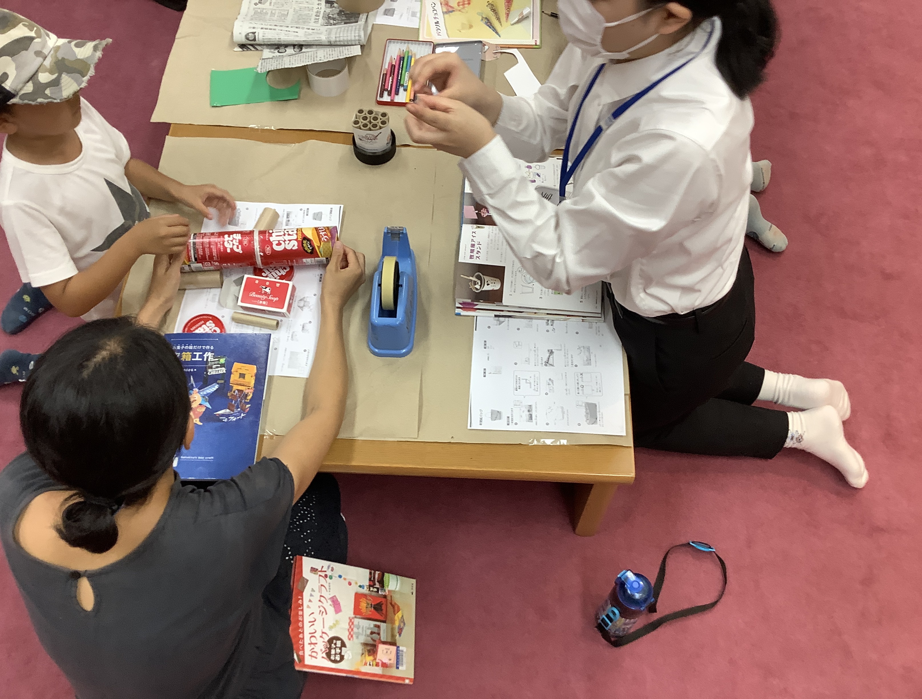 9月15日にSDGsワークショップ「みんなでつくろう エコクラフト」を開催しました。自分の作りたいものを図書館の本から選んでもらい、新聞紙や空き箱、本の帯などを利用してみなさん楽しそうに、すてきな作品を作られていました。