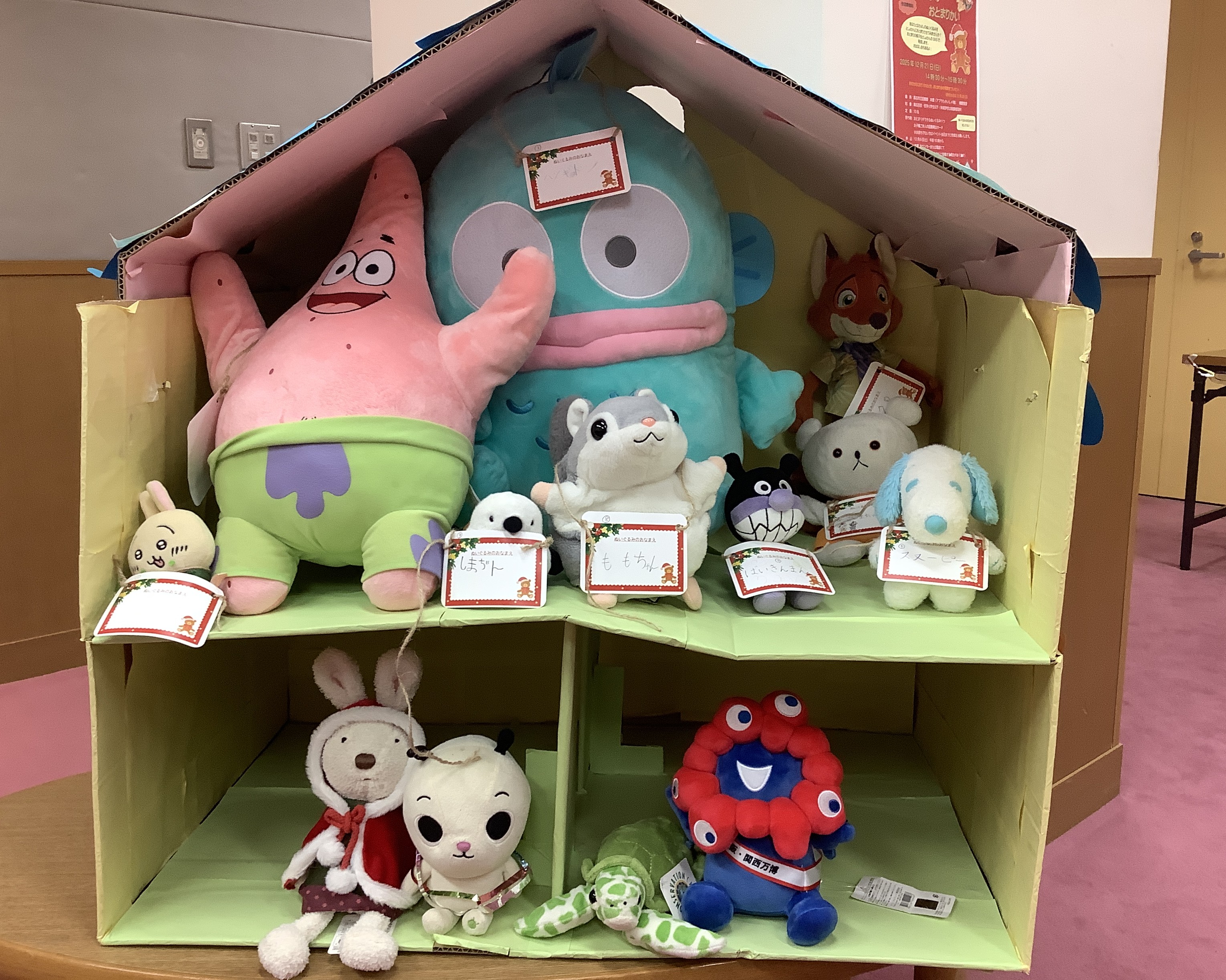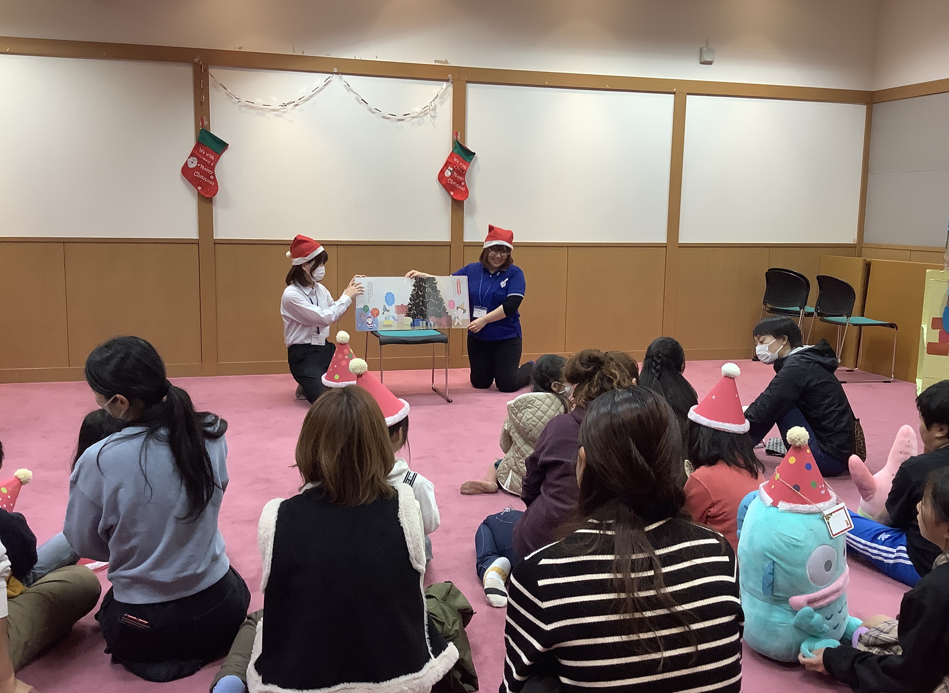 今回のぬいぐるみのおとまり会は、クリスマスをテーマに開催しました。みんなでサンタの防止にシールで飾りつけをして、自分だけの帽子をかぶってぬいぐるみと一緒におはなしを聞きました。