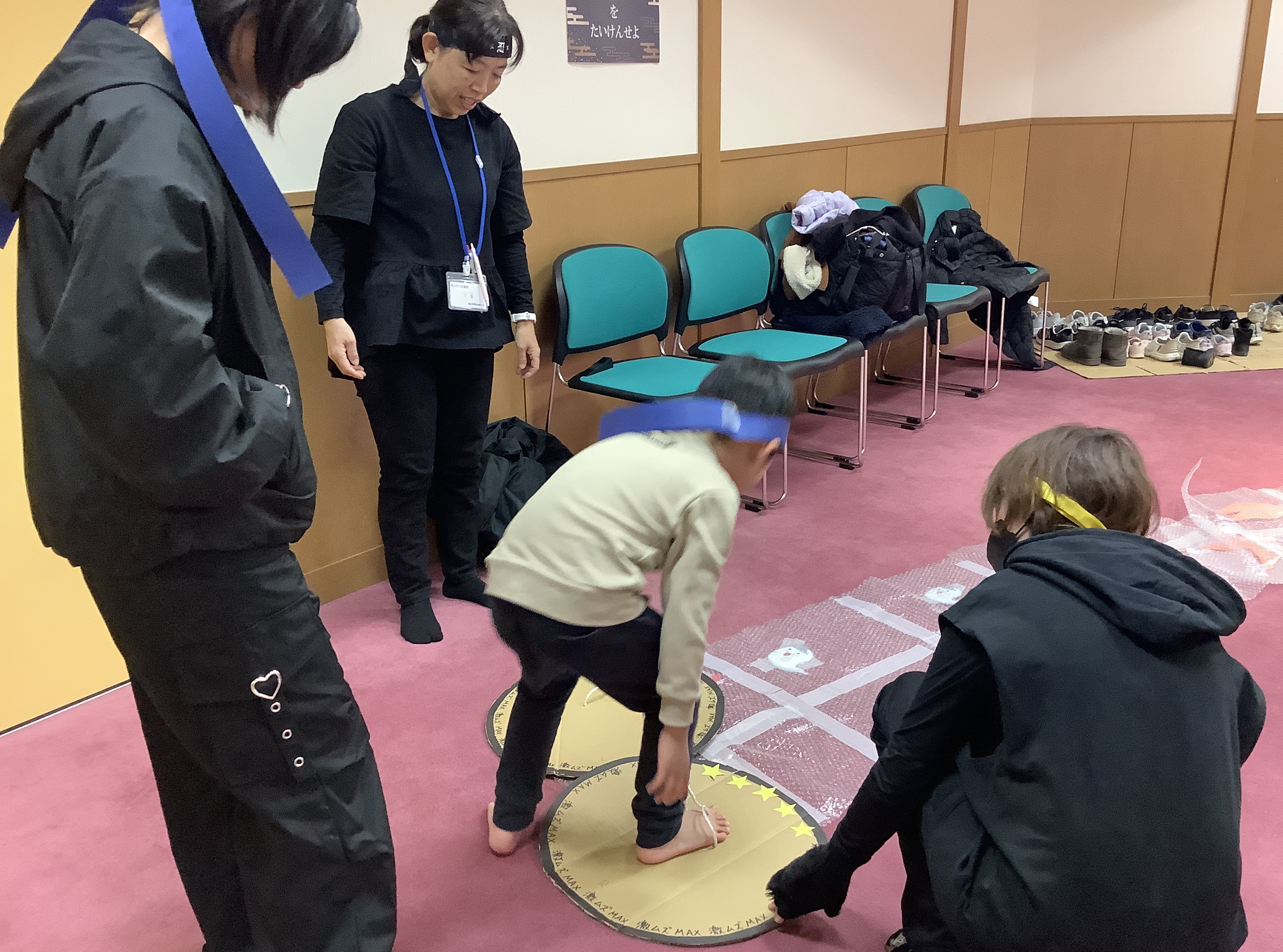 忍者修行ではしゅりけんで的をねらったり、水ぐも歩き、図形パズルや箱の中をさぐったりしましたね。