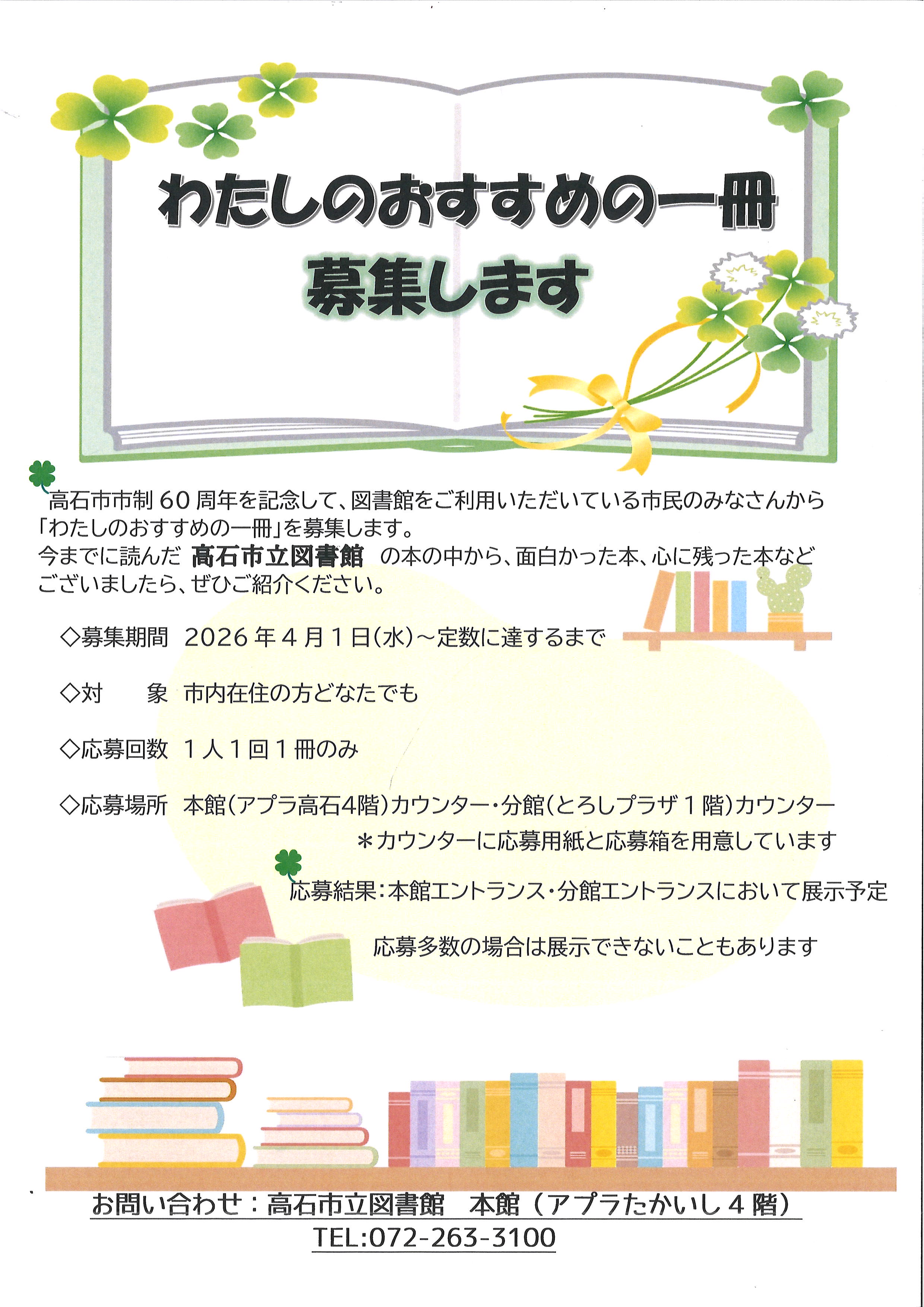 60周年を記念して、図書館をご利用いただいている高石市民の皆さんが選ぶ”わたしのおすすめの一冊”を募集します。
