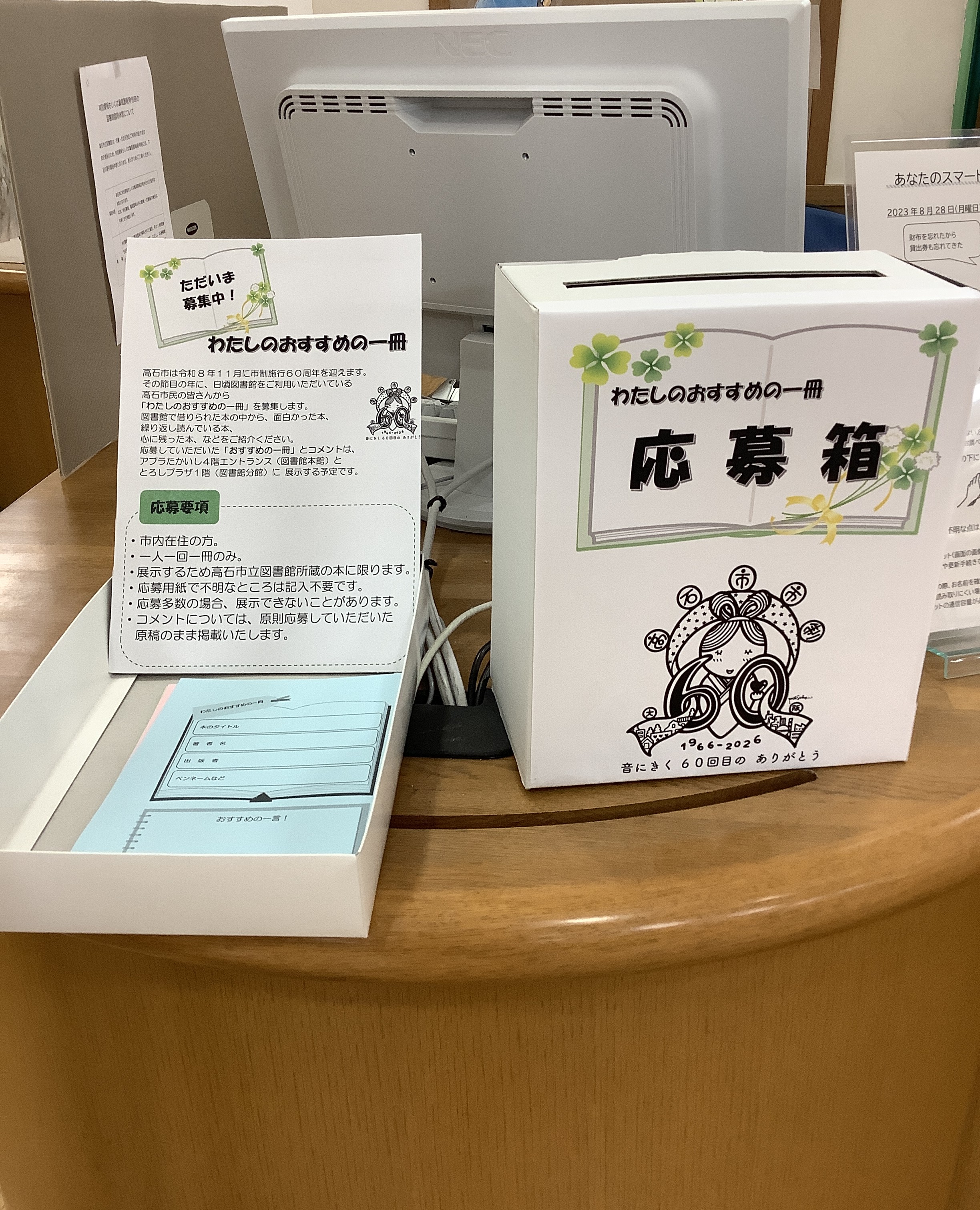 図書館に所蔵している本のなかから、面白かった本、おすすめの本、心に残った本などを応募用紙に記入し”わたしのおすすめの一冊”応募箱に入れてください。いただいたコメントとともに展示させていただきます。たくさんのご応募お待ちしております。