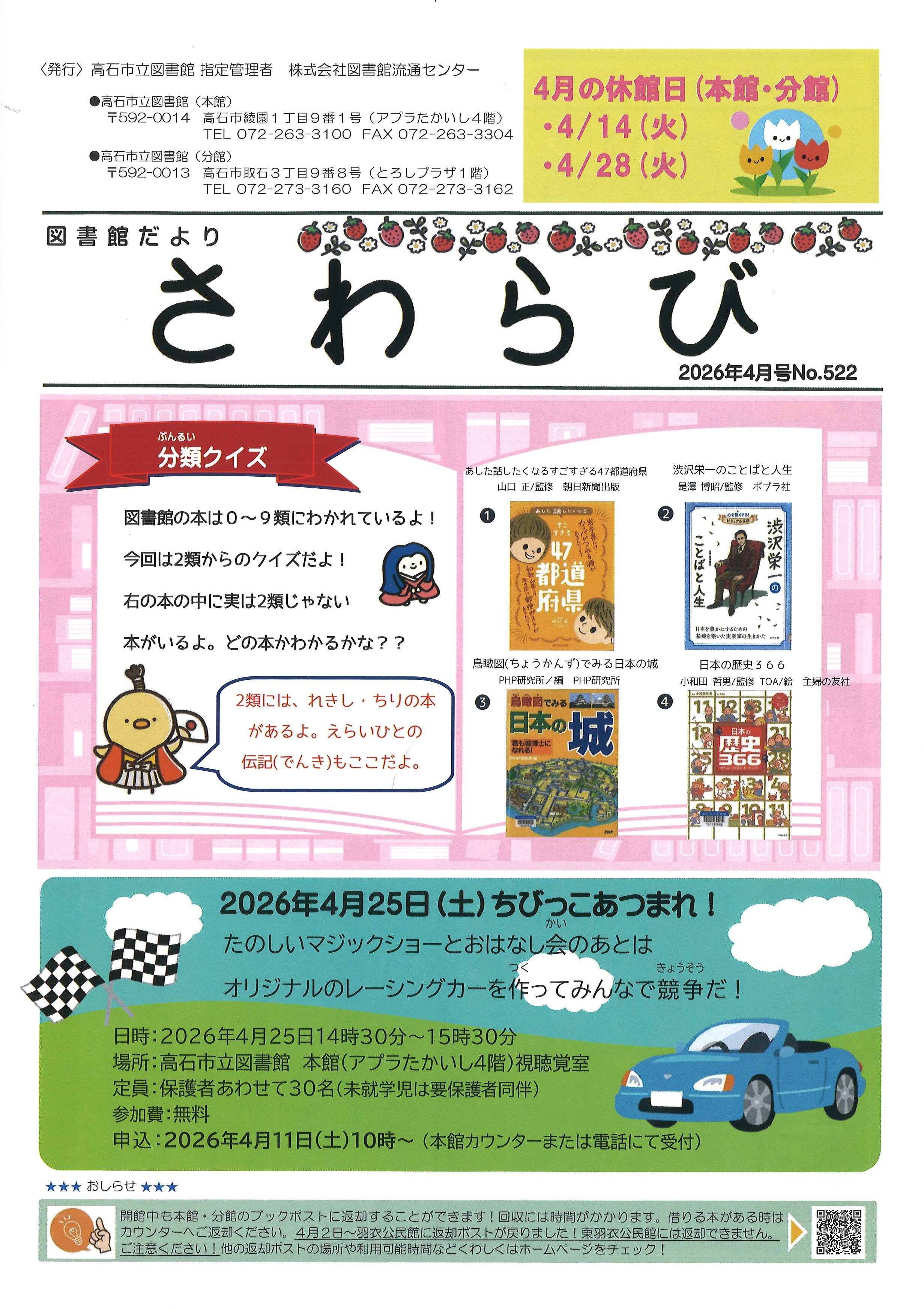 | 図書館では、図書館だより「さわらび」・「大人のさわらび」を発行しています。 図書館での配布をはじめ、下記リンクからもダウンロードしていただけます。 館内さわらびコーナーにもバックナンバーを設置しておりますので 館内でご自由にご覧いただけます。 |
