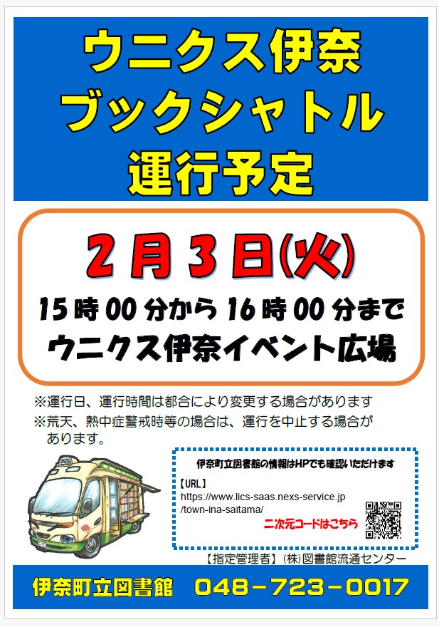 | 2026年1月7日更新 | 移動図書館「ブックシャトル」がウニクス伊奈にやってくる!! |