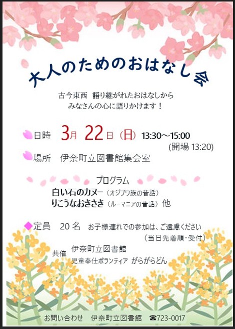 古今東西、語り継がれたおはなしから、皆さんの心に語りかけます! 【問】伊奈町立図書館 電話:048(723)0017 |