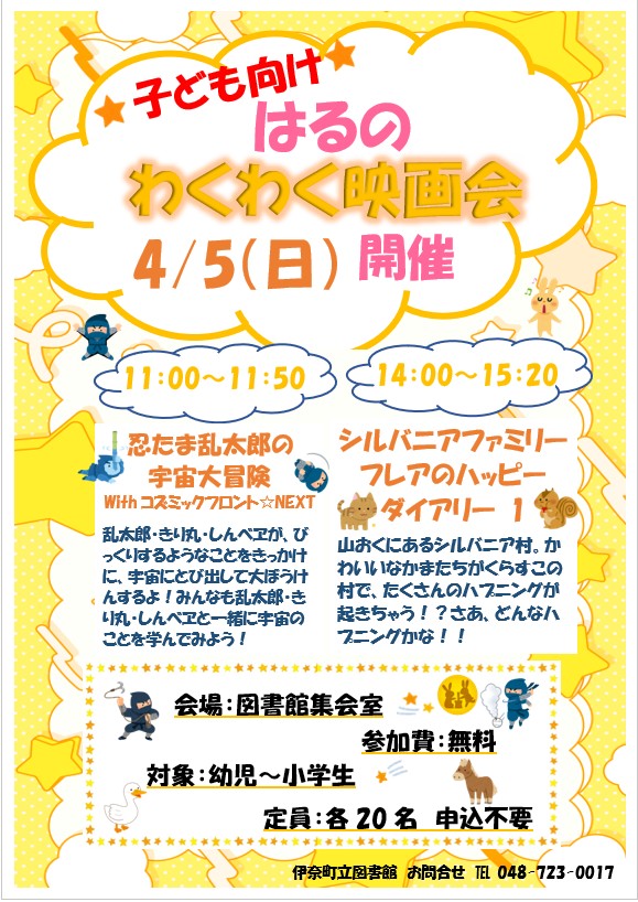 としょかんでわくわくするえいがをかいさいするよ。 かぞくやともだちとみにきてね。 【問】伊奈町立図書館 電話:048(723)0017 |