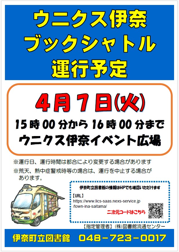 | 2026年3月3日更新 | 移動図書館「ブックシャトル」がウニクス伊奈にやってくる!! |