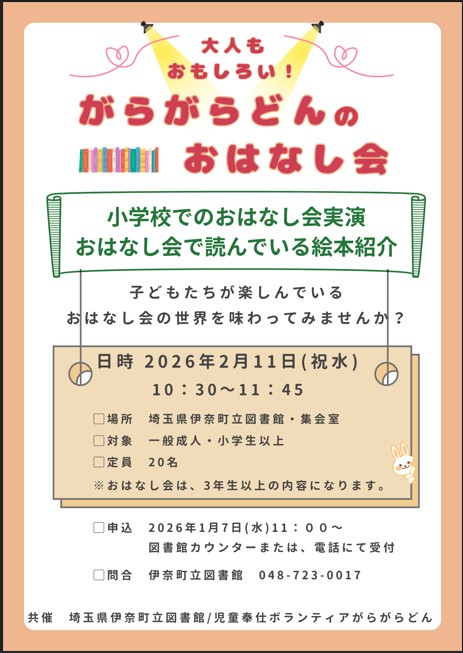 ご参加お待ちしております。 【問】伊奈町立図書館 電話:048(723)0017 |