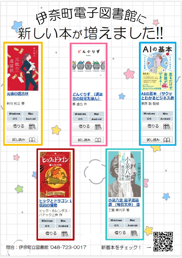 2パック50タイトルの本を同時に何人でも読むことができます。 お友だちや家族と一緒に同じ本を読んで楽しみましょう。 読み放題パックはこちらから 【問】伊奈町立図書館 電話:048(723)0017 |