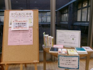 11月11日(火曜日)に図書館ホールで開催予定の「カフェおこしやす」に合わせて、本を集めています。